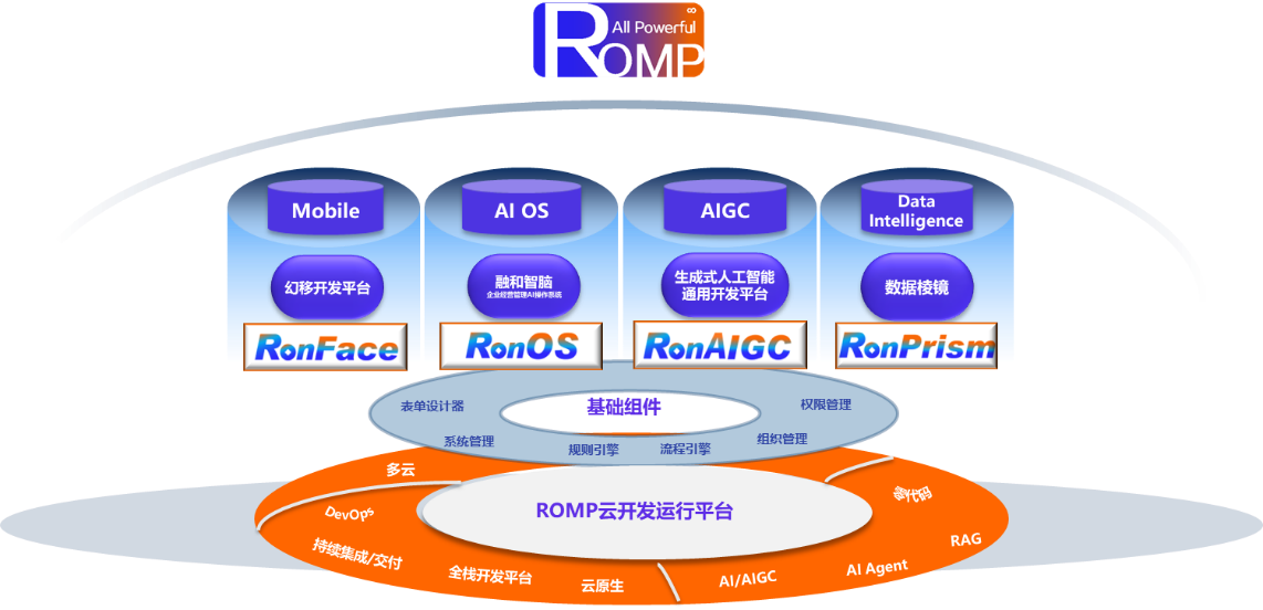 ROMP8不仅是一个高性能、高可用、可扩展的技术运行环境,更是一个面向未来的企业智能中枢——通过内置的RonOS融和智脑(集成规则引擎、知识图谱、算法仓库)与RonAIGC企业级智能体开发平台,实现业务逻辑与智能决策的深度融合;通过可视化低代码工具链,赋能业务人员与开发者高效协同,加速软件全生命周期的敏捷交付与迭代。最终,ROMP8致力于成为企业数字化转型与智能化升级的核心引擎,支撑千行百业构建自主可控、持续创新、安全可靠的智能应用体系。